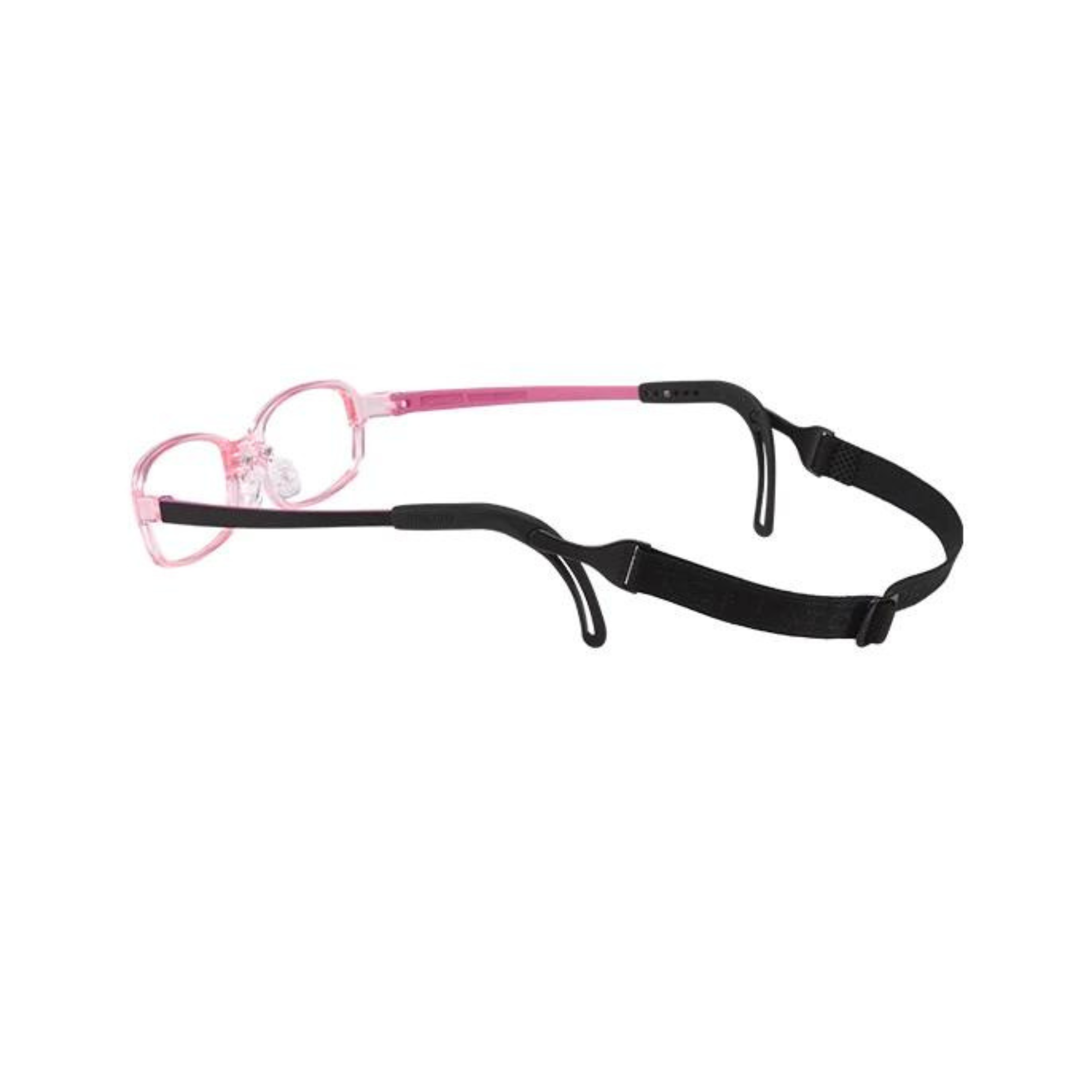 This particular rectangular frame comes in a crystal pink front with two-tone black and pink arms as well as matching adjustable ear tips and a black headband.